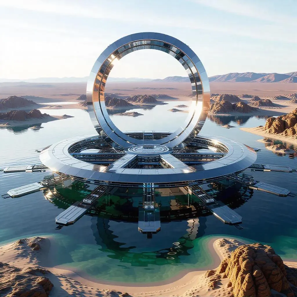 Generate awe-inspiring AI imagery of futuristic desert shoreline bases with chrome ring structures, glass complexes, and floating platforms. Explore sustainable futuristic design blending advanced technology and natural landscapes. Perfect for sci-fi concepts, architectural visualization, and harmonious innovation projects. Create visionary AI visuals effortlessly with VivaGO's cutting-edge tools.