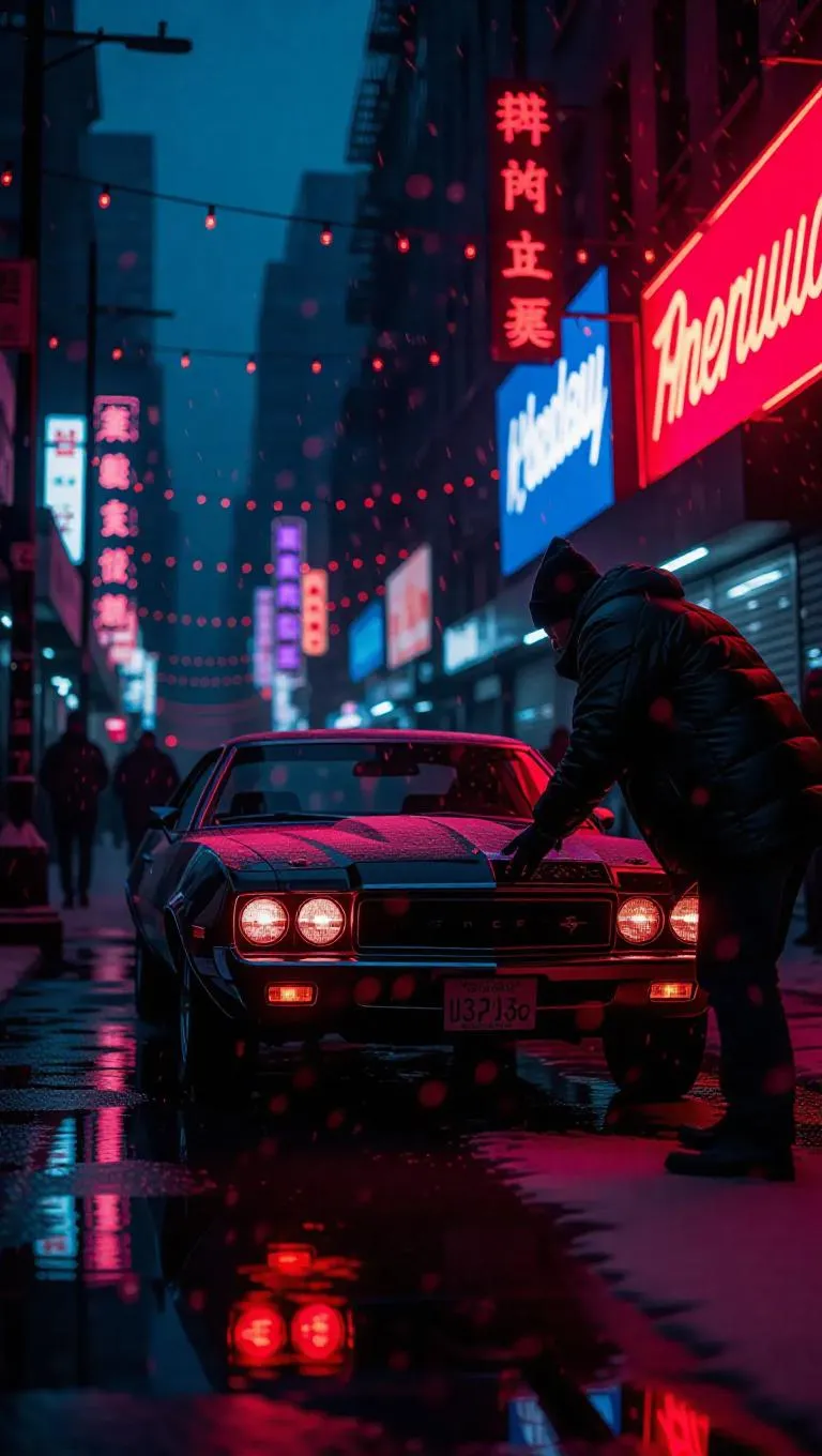 A neon-lit alley pulses with glitchy reds and purples as a car thief hotwires a classic car, his face visible, fingers tapping rhythmically on physical buttons. Snow falls softly onto polished pavement as vintage billboards flicker ads in retro fonts. Futurist noir composition with dry surfaces and soft ambient lighting.