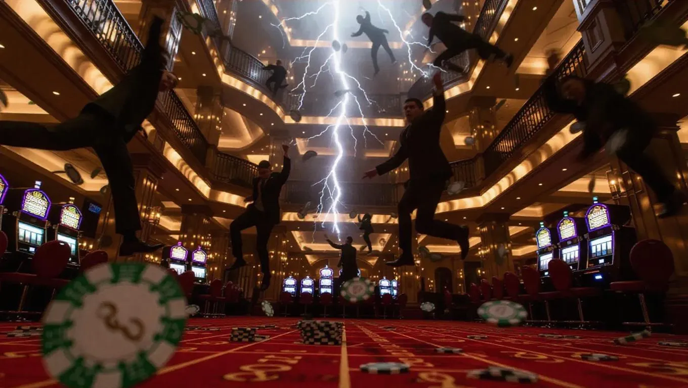 A dramatic casino heist in progress, agile burglars scuttling along the ceiling in a grand atrium, glittering chips and money caught midair in slow motion. Giant lightning bolt sculptures and tiered carpets contrast the chaos. Dynamic panoramic camera movement, freeze-frame intensity with hazy gray lighting.