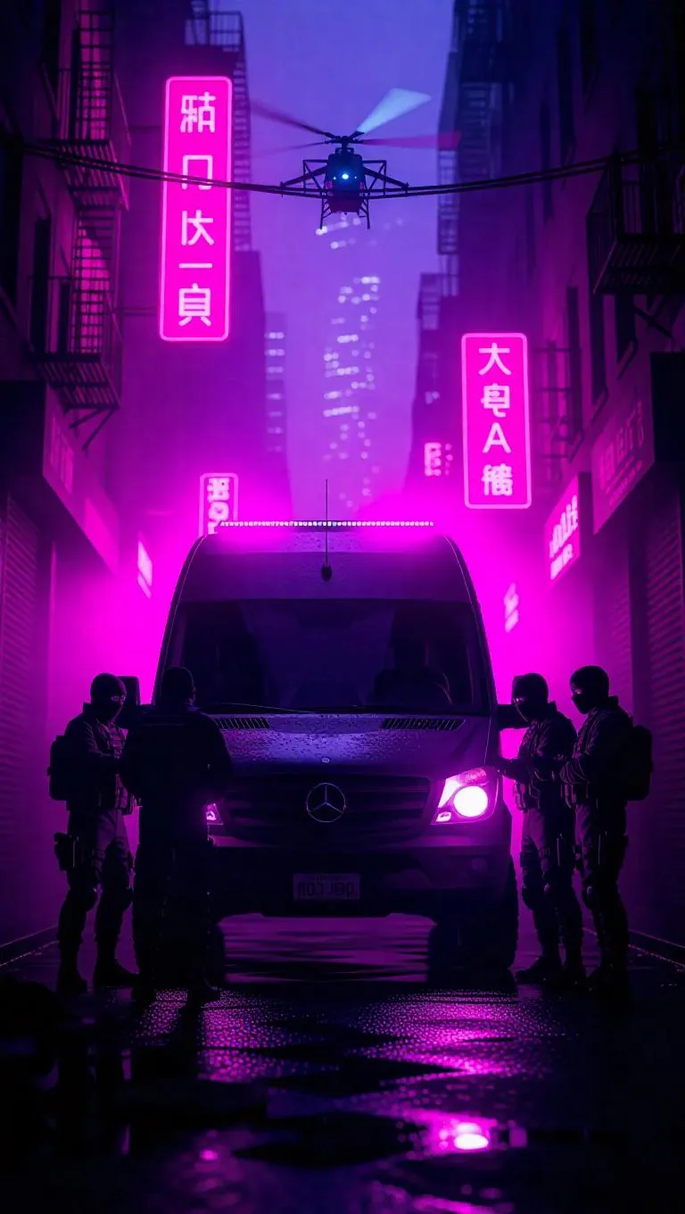 In a dimly lit alleyway, a crew of masked thieves huddle around a futuristic armored van, its engine still warm. Neon signs flicker above, casting a mix of red and purple hues over their tense faces. A police chopper circles in the distance, its spotlight piercing the fog. Strong diagonal lines and an industrial palette emphasize the gritty urban setting.