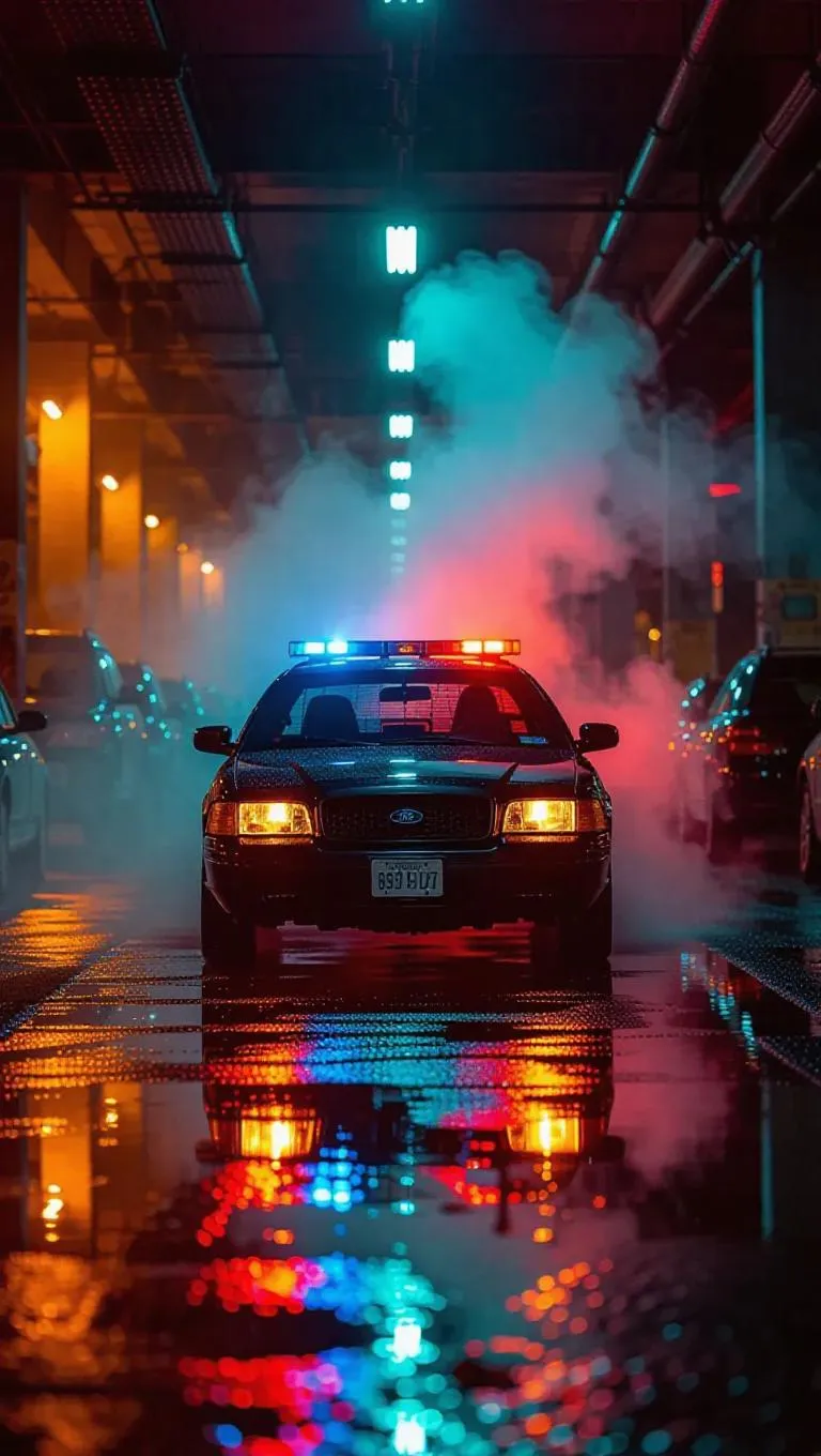 Within a shadowy parking area overlaid with vapors and flickering lights, a covert arms deal unfolds atop slick concrete. Steel daggers catch the light as rival crews size each other up behind colorful sunglasses and fierce body art. A lone police car prowls outside, its siren glow bleeding through the grated entrance like a heartbeat. Cigar smoke and cash flutter in slow motion, caught in the heavy silence before chaos. Atmospheric composition favoring low-key hues with striking highlights, strong vanishing-point lines drawing focus toward the central exchange.