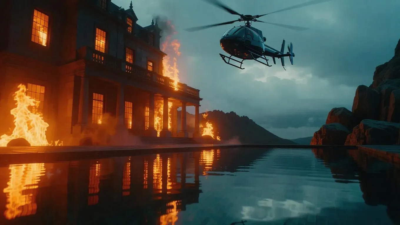 A booby-trapped mansion explodes in the highlands, fireballs silhouetting rugged boulders, as a helicopter escapes into the stormy sky. Infinity pool reflects both fire and swirling clouds. Epic wide shot with deep layering and orange-teal blockbuster palette.