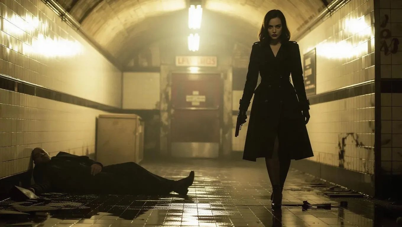 An alluring femme fatale in a jet-black trench coat walks through an abandoned subway station, heels echoing off the tiles, revolver at the ready. The flickering light above reveals a crumpled figure sprawled by a shattered ticket booth. Film noir ambiance, stark lighting, muted colors.