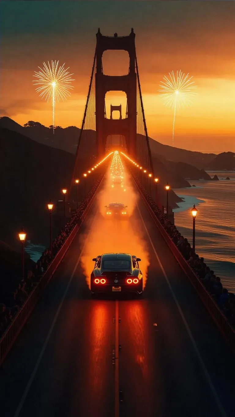 A surprise street race on a bridge over the ocean, engines roaring under twilight as fireworks brighten the backdrop. Spectators fill the railings, faces lit by sparklers. High-speed cinematic motion and fiery orange-toned gradients.