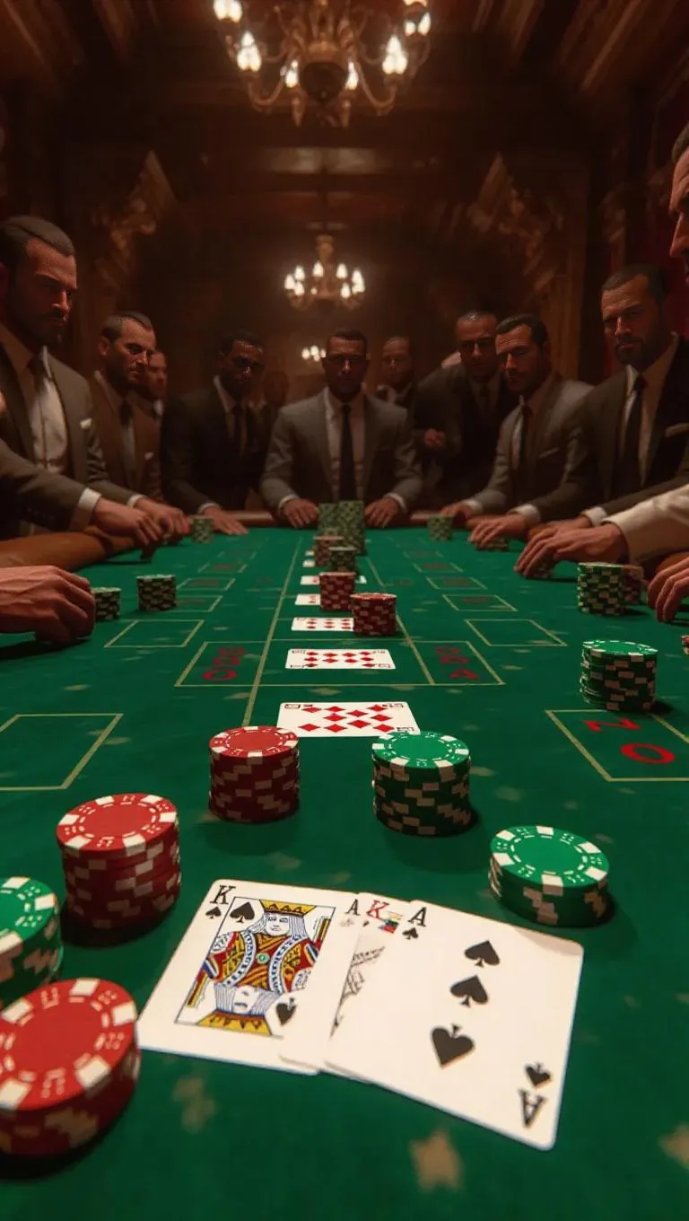 In an opulent underground casino in Liberty City, a tense high-stakes poker game is abruptly interrupted by an unexpected winning streak. Tables overturn, chips scatter, and players look shocked, the room erupting into chaos as they prepare to reclaim their losses.
