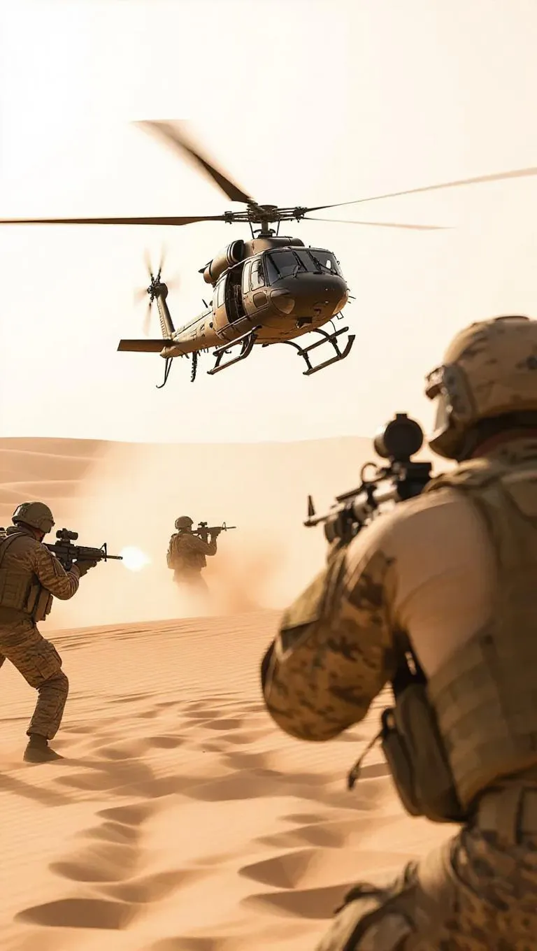 A stolen helicopter lifts off from a desert outpost, rotors whipping up sand, military operatives taking aim from dunes, shots narrowly missing, dramatic arid landscape, warm sandy tone, tension-filled atmosphere, desert chaos.