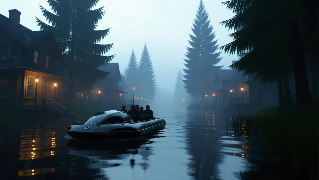A getaway hovercraft skims across a foggy river town, its passengers narrowly eluding police searches. The scene is brightened by the warm flicker of torches and the dense fog of the banks.