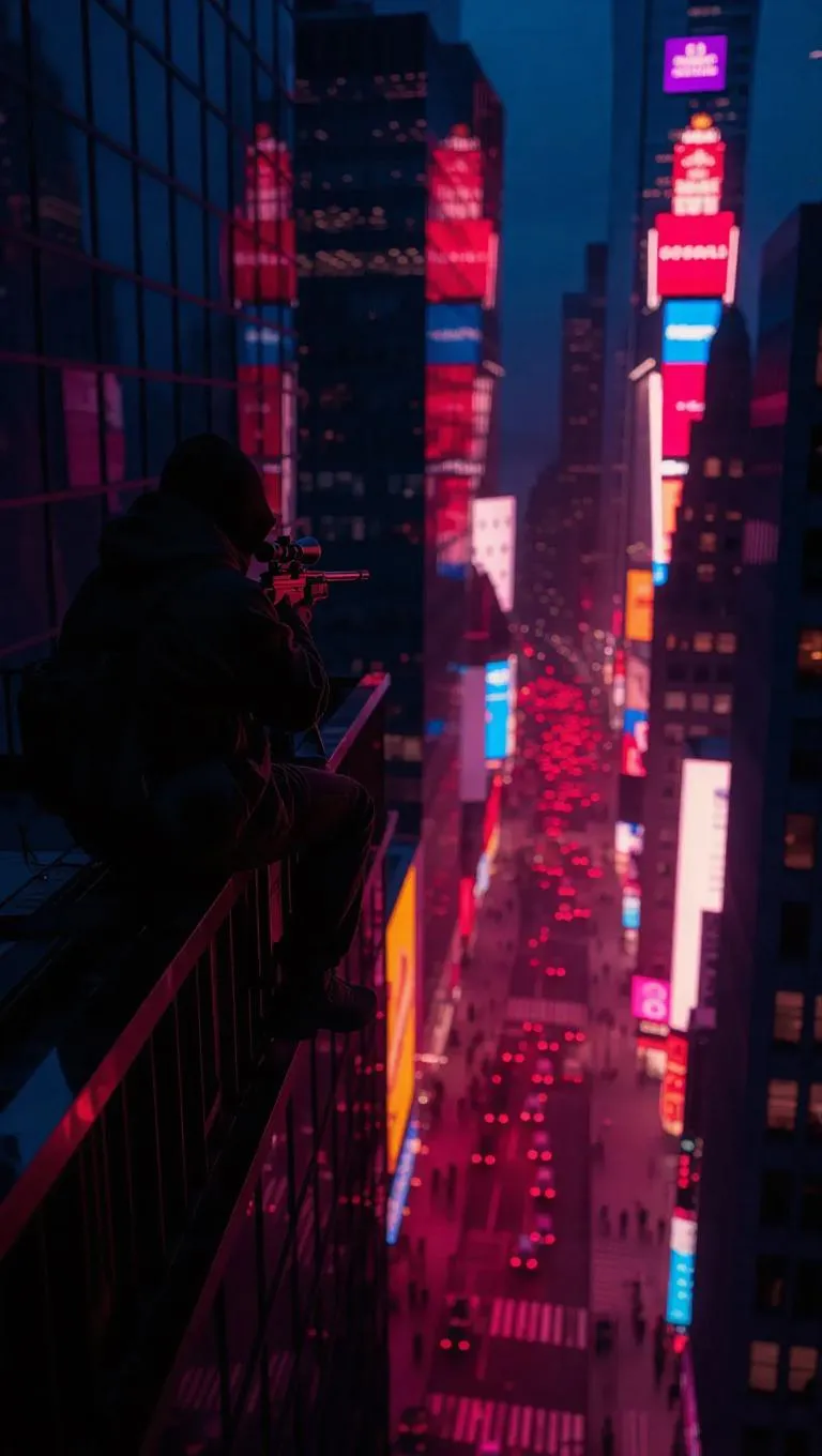 A lone sniper perches on a skyscraper rooftop, overlooking a bustling city square bathed in twilight. Their target, a high-profile criminal, exits a luxury car below. The composition highlights the vast, neon-lit cityscape and the sniper's solitary vigilance.