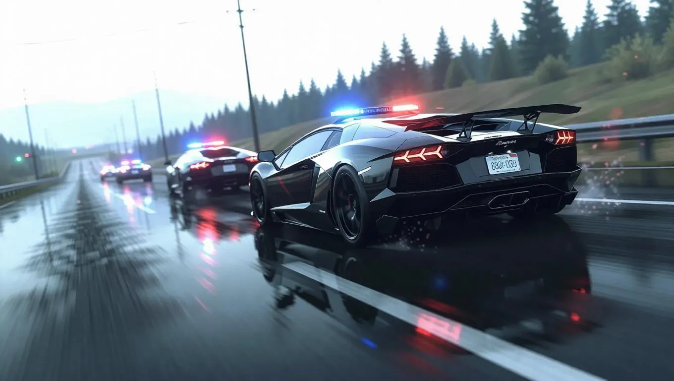A stolen sports car speeds down an empty highway, its tires screeching as it narrowly avoids a roadblock. Police vehicles chase closely behind, their sirens creating a chaotic symphony. The scene is framed with dynamic motion blur and a desaturated, cinematic palette.