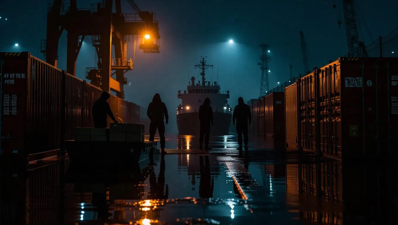 A moonlit dockyard reverberates with sirens as hooded figures offload crates into a catamaran bobbing beside damp pilings. Shipping containers hover like barriers, each marked with gang emblems and faded stains. Overhead, a crane’s halogen floodlight spills light on the figures in vivid contrast against the harbor mist. Beyond the chain-link fence, flashing alarms disrupt the calm, their reflections flickering in distorted puddles. Tight medium shot capturing glistening tension and contrasting shadows, with gritty metal textures and intense framing.