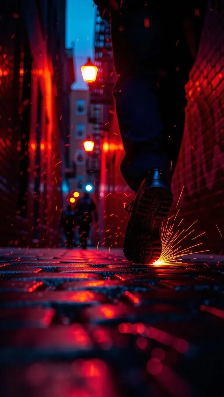 An urgent pursuit through a winding alley at dusk, police boots clanking on cobblestones behind a cornered evader darting into doorways. Sparks fly from a broken electrical pole, casting light on graffiti that tells a story of the city. Perspective shot, soft motion blur, colorful glow.