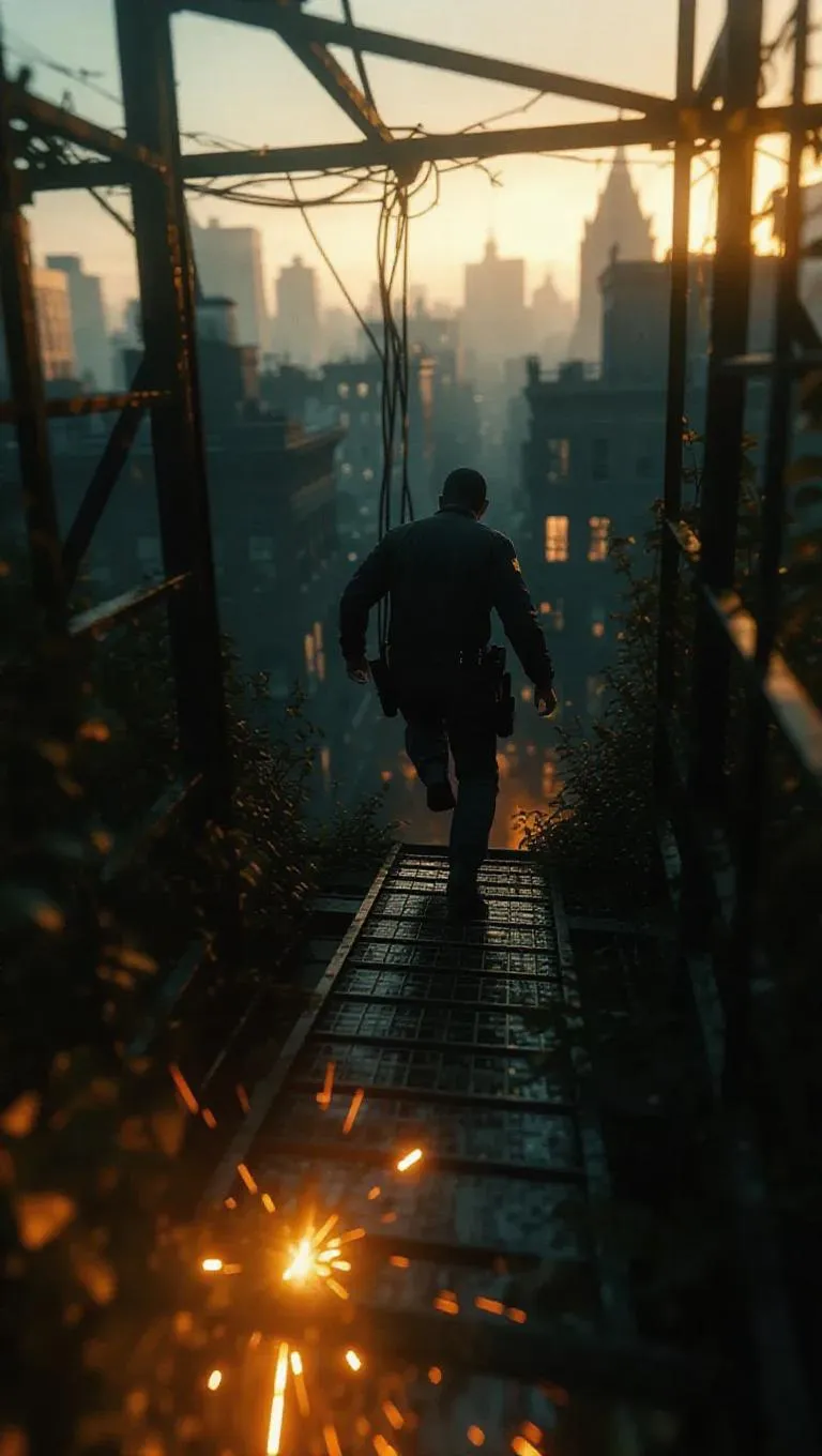 A high-stakes chase across a rooftop garden at dawn, police boots echoing against metal girders behind a desperate burglar climbing fences. Sparks fly from the rooftop signage, exposing tangles of vines and flowers that disappear into the gloom. Dutch tilt, rapid motion blur, warm-cool lighting contrast.