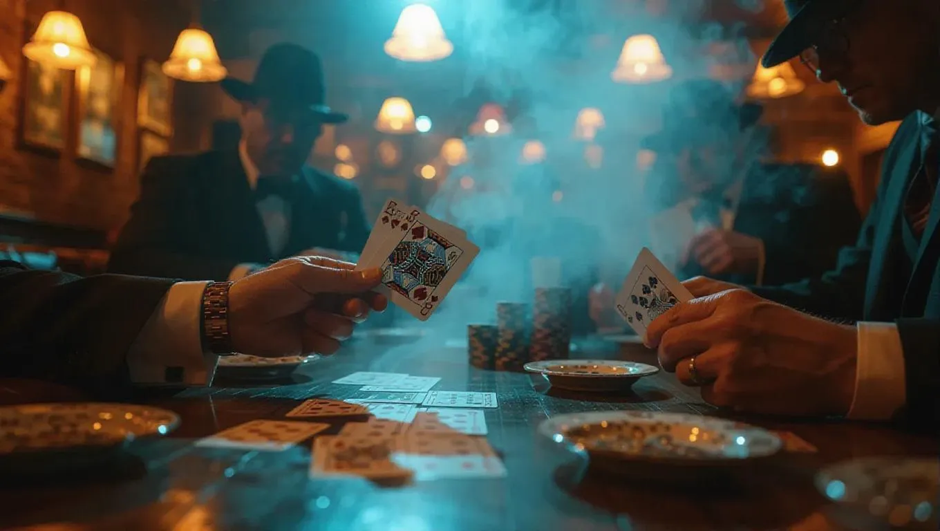 A covert poker gathering between dealers in a smoke-filled dive, where guns lie beside soup bowls and grimy hands hold winning cards. Smoke flows around low-hanging lights. Gritty, jazz-noir visual texture with deep shades.