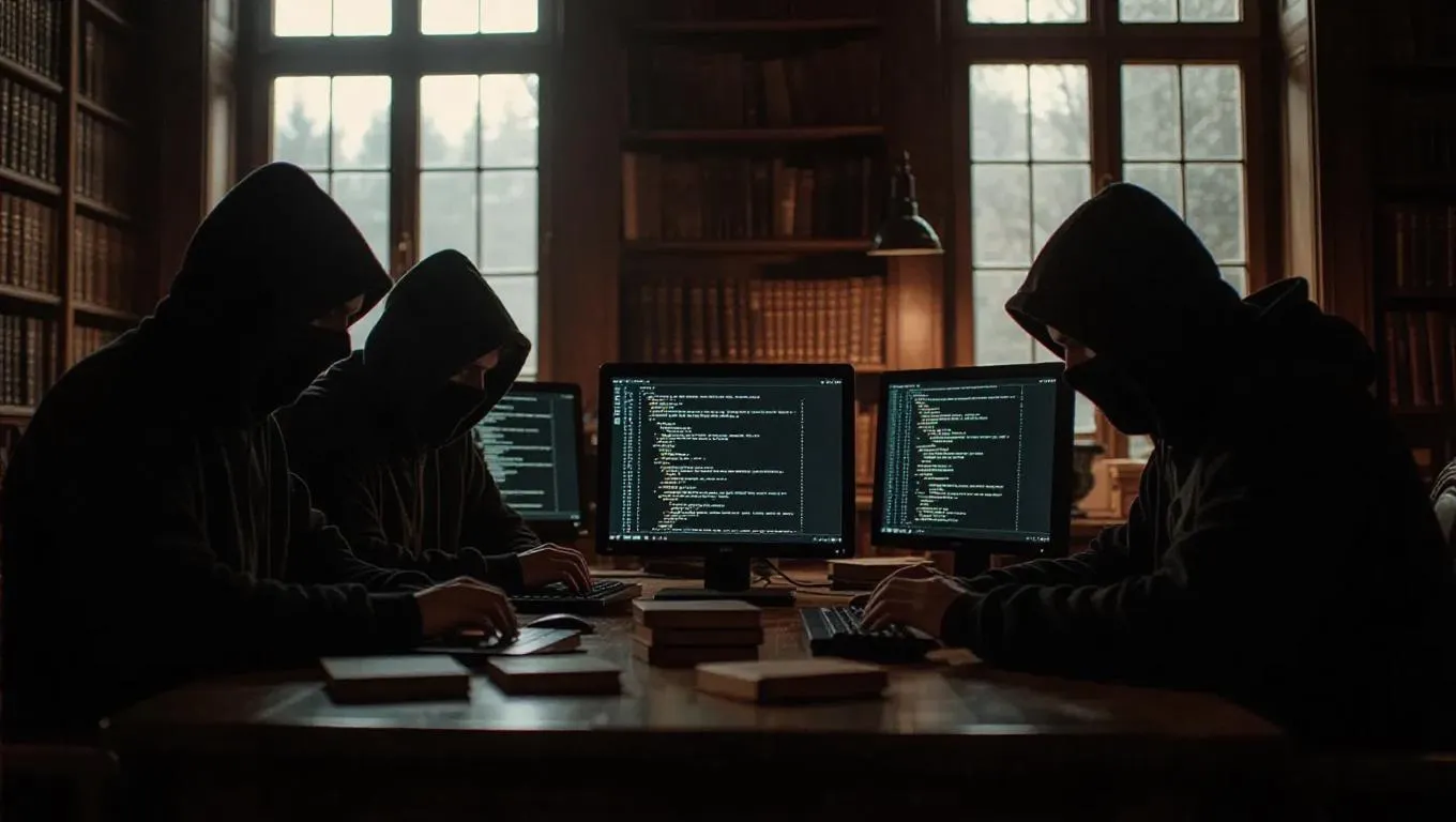 A group of hackers in a dimly lit library surrounded by books and old monitors, uploading a virus as dusty windows reflect code across their faces. Mysterious cyber-thriller vibe with soft lighting and nostalgic focus.