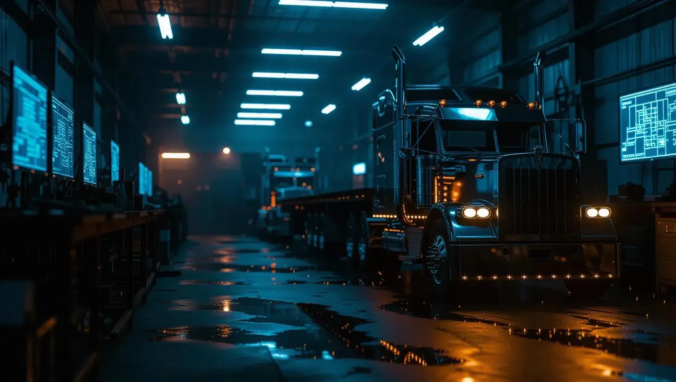 A secluded lane workshop buzzes with welding sparks, where customized trucks are rebuilt for traffickers. Holographic blueprints flicker on flickering screens, and chrome dazzles under weak lighting. Gritty cyber-crime aesthetic with oily reflections and heat distortion.
