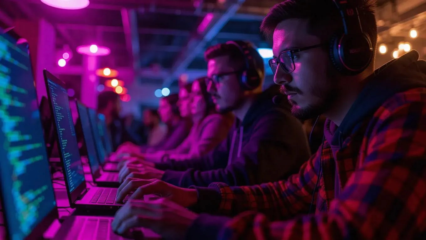 A group of hackers in a cyber café surrounded by patrons and laptops, uploading a virus as vibrant screens reflect code across their faces. Lively cyber-thriller vibe with dynamic lighting and energetic focus.