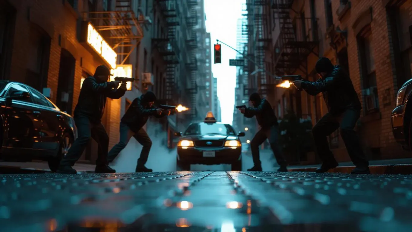 A rival gang ambushes a crew in a narrow city street, their weapons glinting in the flickering light, echoes reverberating off the brick buildings. A car alarm blares in the distance, adding to the tension. The scene is captured with a gritty, urban aesthetic, emphasizing the raw energy and danger.