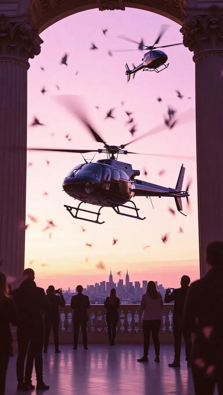 A stolen helicopter lifts off from an art museum terrace, rotors whipping up art supplies, curators taking aim from windows, shots narrowly missing, dramatic cultural backdrop, soft pastel tone, tension-filled atmosphere, artistic chaos.