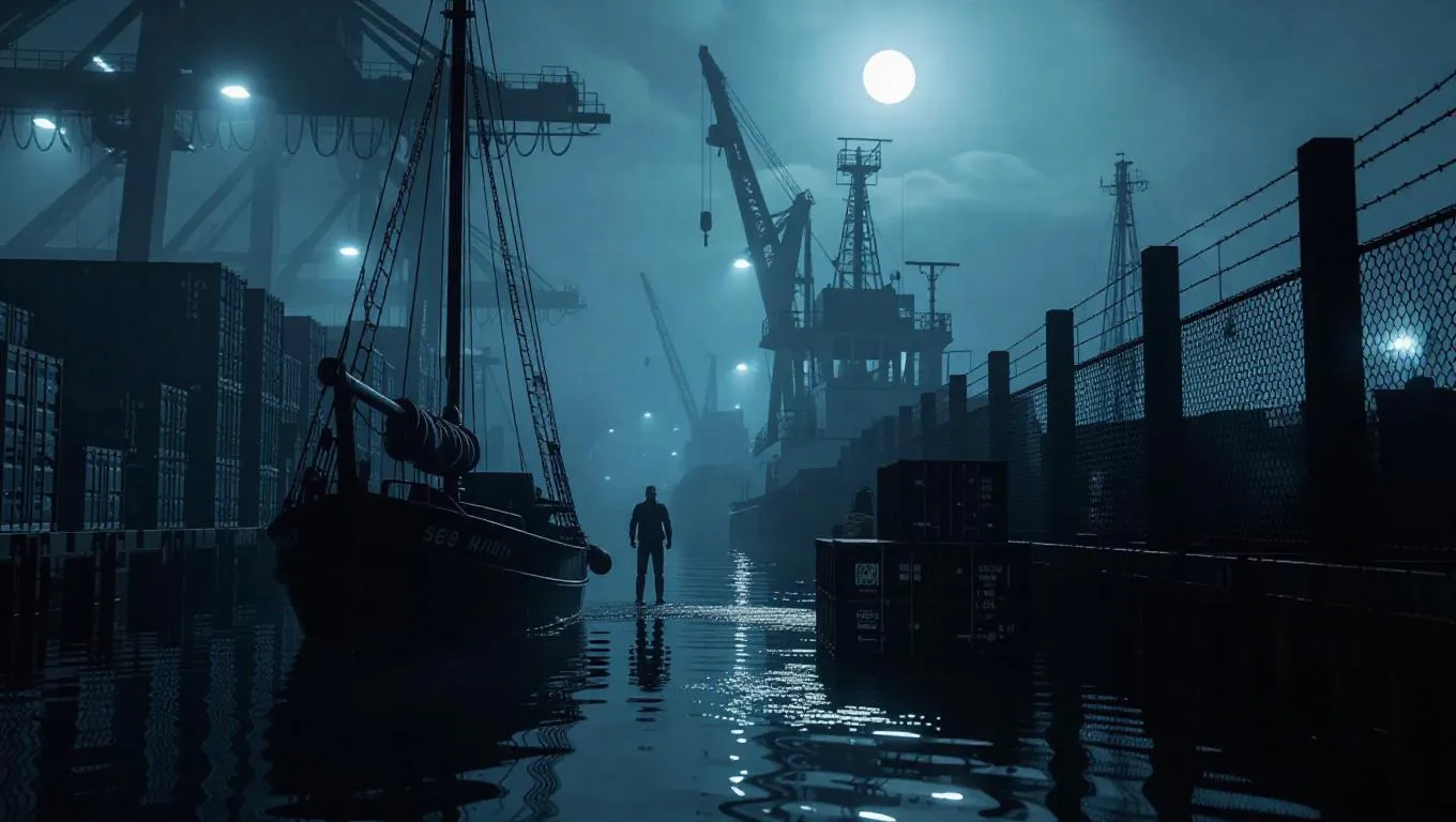 A moonlit dockyard vibrates with alarm sounds as masked thieves unload crates into a sailboat bobbing beside lichen-covered pilings. Shipping containers stand ominously, each tagged with gang emblems and grim stains. Overhead, a crane’s halogen floodlight bathes the figures in intense shadows against the harbor mist. Beyond the chain-link fence, flashing alarms pierce the dusk, their reflections swirling in murky puddles. Tight medium shot capturing glistening tension and dark shadows, with rough textures and suspenseful framing.