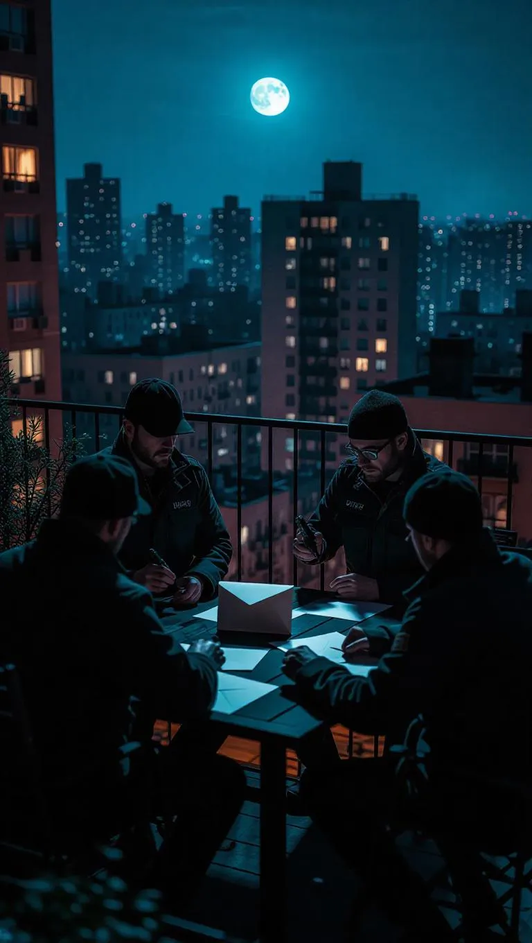 A clandestine meeting unfolds on a rooftop garden bathed in cold moonlight, where casual-dressed negotiators flanked by armed guards exchange envelopes. Below, the city breathes in soft pulses, and a sniper scope glints in the dark. Long-lens compression with cinematic bokeh, stylized atmospheric haze.