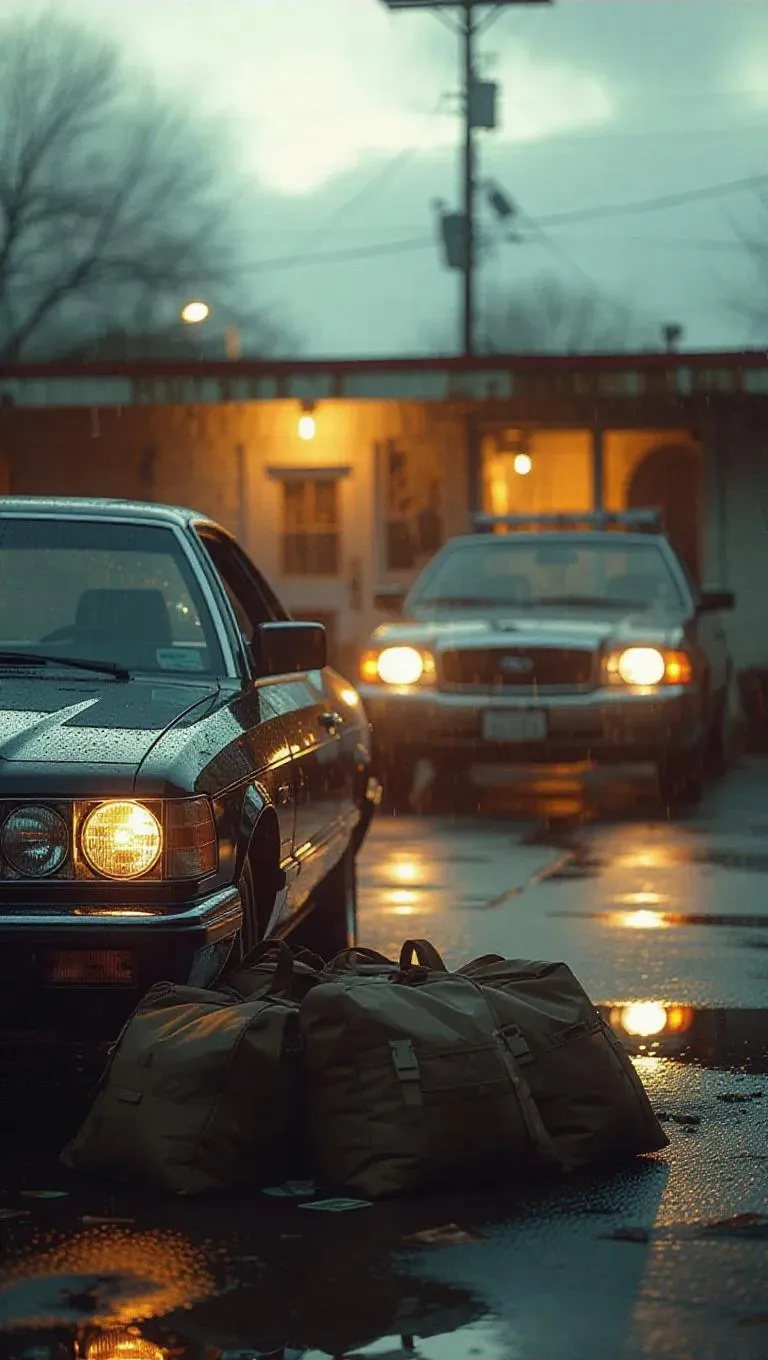 A tense exchange unfolds in a weathered motel parking lot, duffel bags of cash and drugs spread on the hood of an exotic car. Headlights abruptly flood the scene as an unmarked van skids to a stop, capturing the chaos with exploding motion and a harsh, contrasting atmosphere.