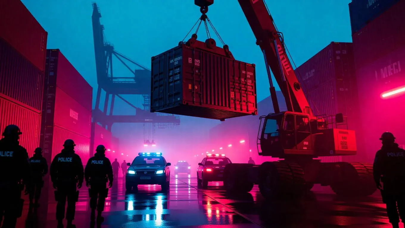 A crew of smugglers operates a crane to lift a container stuffed with stolen relics. Police craft approach, their sirens piercing the air. The scene is drenched in the vibrant glow of neon lights.