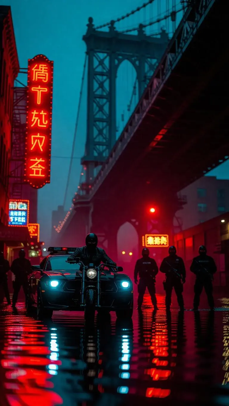 A masked biker gang surrounds a stranded armored car under a crumbling bridge, floodlights casting dramatic shadows, neon signs behind them telling tales of urban struggle.
