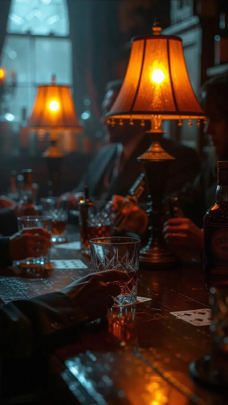 A secret gambling session between icons in a low-light speakeasy, where six-shooters rest beside bourbon glasses and stained fingers reveal secrets. Haze caresses the antique lamps. Gritty, jazz-noir visual texture with sharp details.