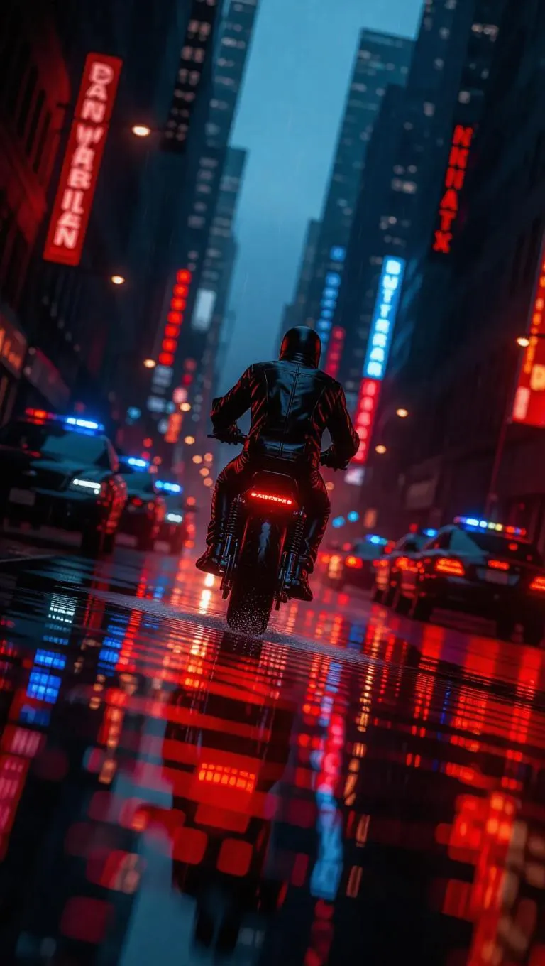 A shadowy figure in a black leather jacket speeds down a rain-slicked boulevard, backlit by flashing emergency lights and chaotic street scenes. Digital reflections shimmer across puddles, and behind him, a chain of patrol cars twist through city shadows. Motion-capture angle from below, sparks trailing from the tailpipe, dramatic shallow depth of field.
