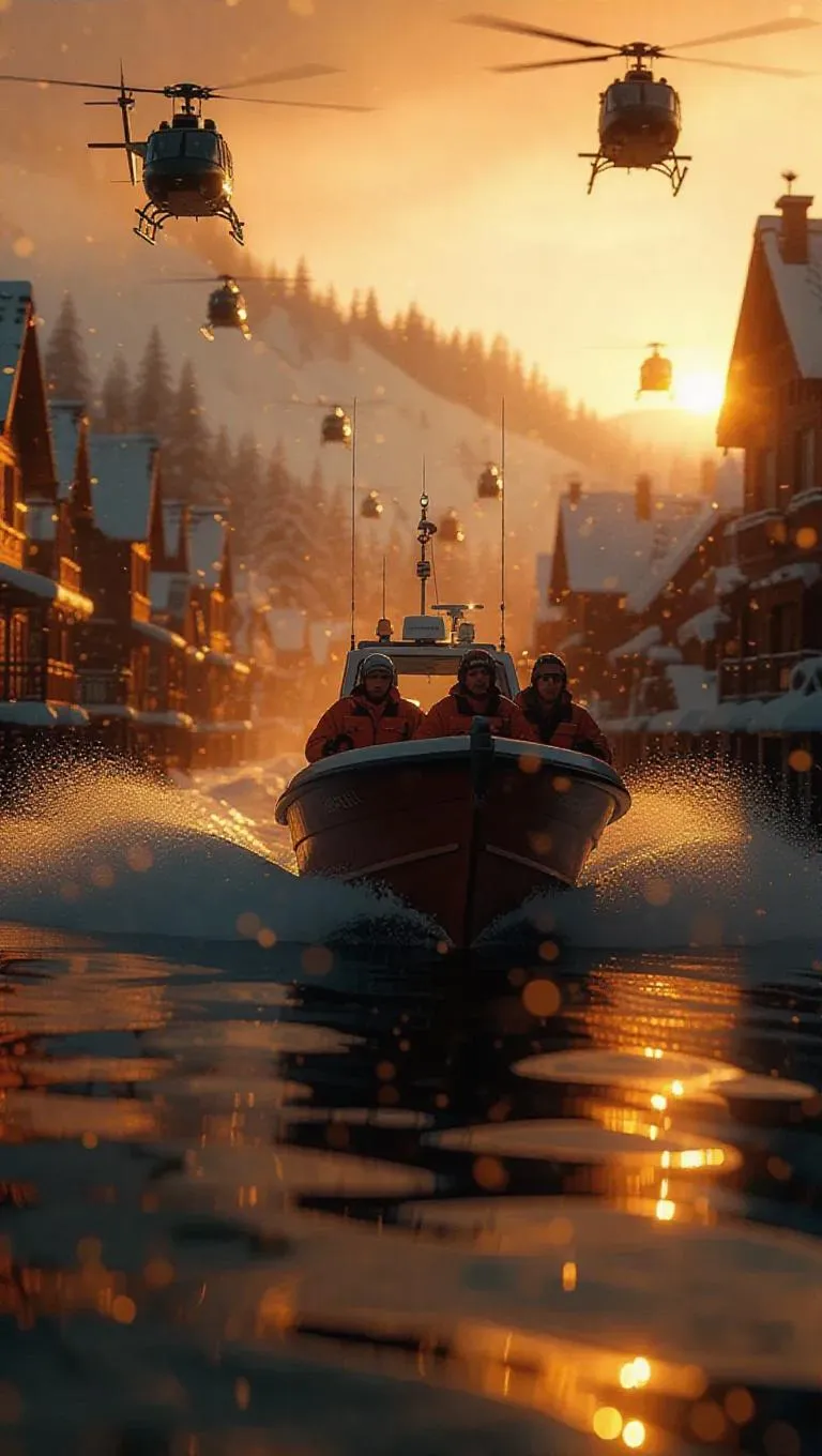 A getaway boat races through a snow-covered fishing village, its crew evading searchlights from helicopters. The scene is cast in the golden hues of streetlights and the pale white of falling snow.