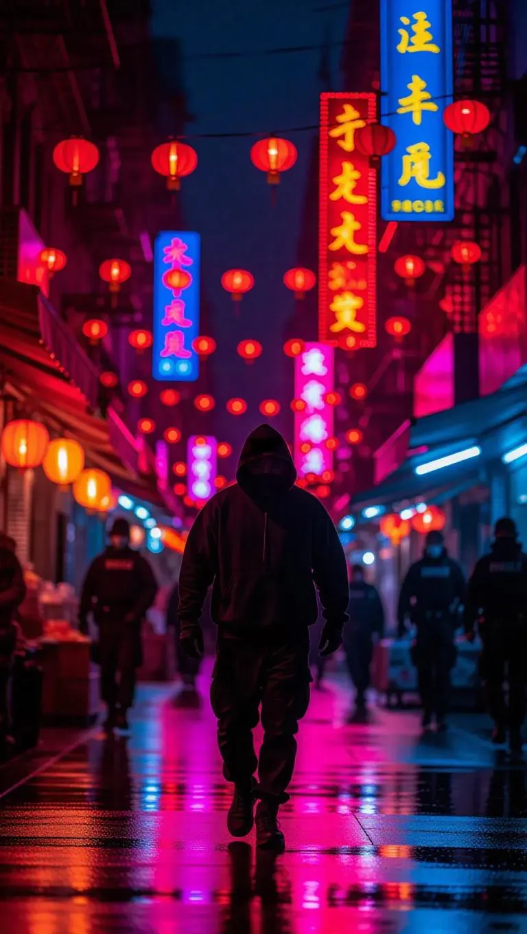 A fugitive in a battle-worn sweatshirt escapes through a neon-lit Chinatown market, vibrant signs blurring behind him, as police units converge quickly. Lanterns illuminate the dark street. Drone view with elaborate depth and environmental storytelling.