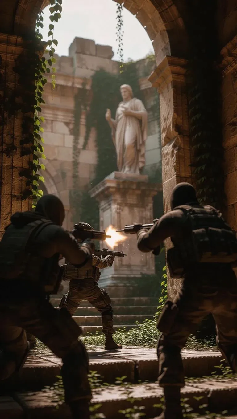Two rival gangs confront each other in an ancient ruins site, weapons clashing and echoing off the crumbling stones. Overgrown vines and statues enhance the chaotic atmosphere. The scene is captured with an earthy, historical palette, emphasizing tension and danger.