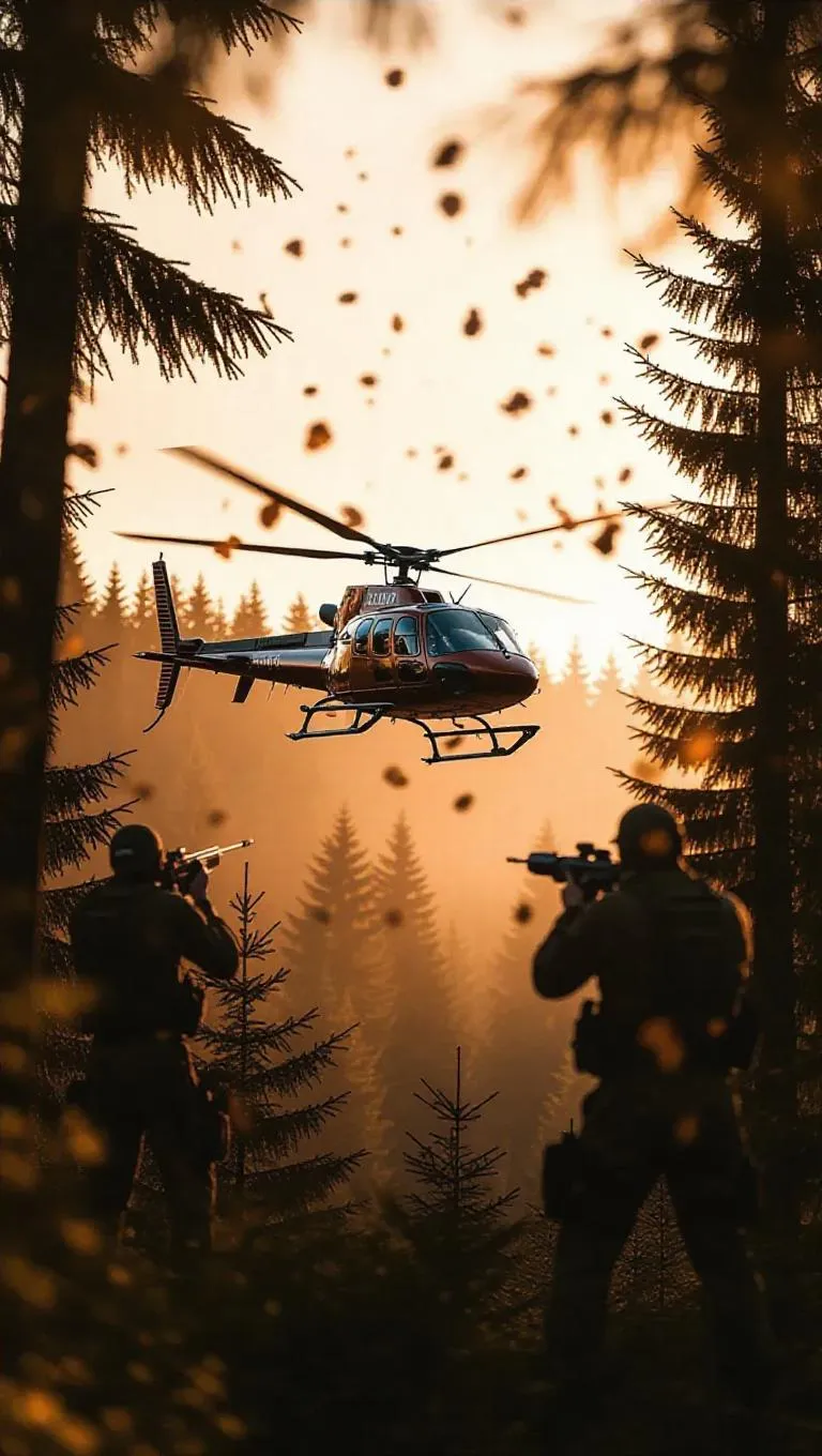 A stolen helicopter lifts off from a dense forest clearing, rotors whipping up leaves, park rangers taking aim from nearby trees, shots narrowly missing, dramatic wilderness backdrop, warm vibrant tone, tension-filled atmosphere, natural chaos.