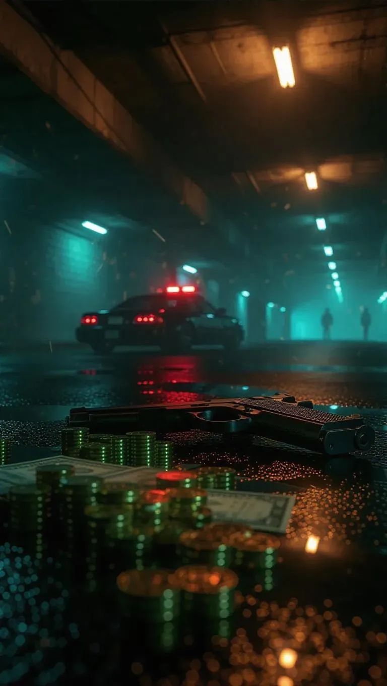Within a dimly lit parking structure immersed in fog and flickering bulbs, a hidden arms deal unfolds atop slick concrete. Brass guns glint beneath the light as rival crews watch each other behind stylish glasses and fierce ink. A lone police cruiser prowls outside, its siren glow bleeding through the grated entrance like a heartbeat. Glittering embers and scattered currencies float in slow motion, caught in the heavy silence before chaos. Atmospheric composition favoring low-key tones with vivid highlights, strong vanishing-point lines drawing focus toward the central exchange.