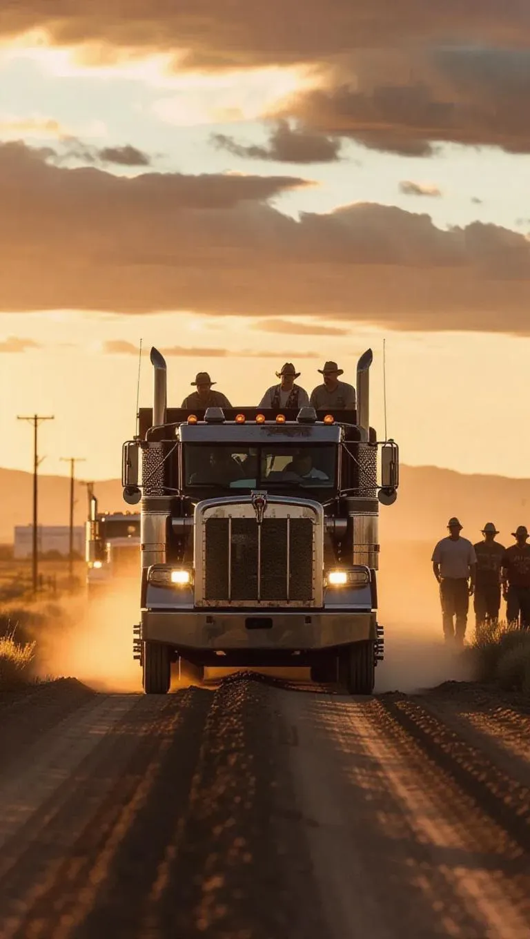 A heavy-duty truck rumbles down a dusty back road at sunset, with workers having a good time in the bed. Industry murals tell the stories of laborers along the route, while country tunes and chatter mix in the air. Earthy tones with rustic color grading and lens flares.
