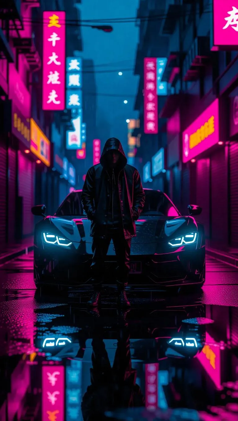 A neon-lit alley pulses with glitchy yellows and pinks as a confident thief hotwires a luxury sports car, his face sleek and poised, fingers expertly interfacing with augmented reality. A light drizzle patters down as advertisements shimmer with electrifying animations above. Futurist noir composition with dark reflections and intricate rim lighting.
