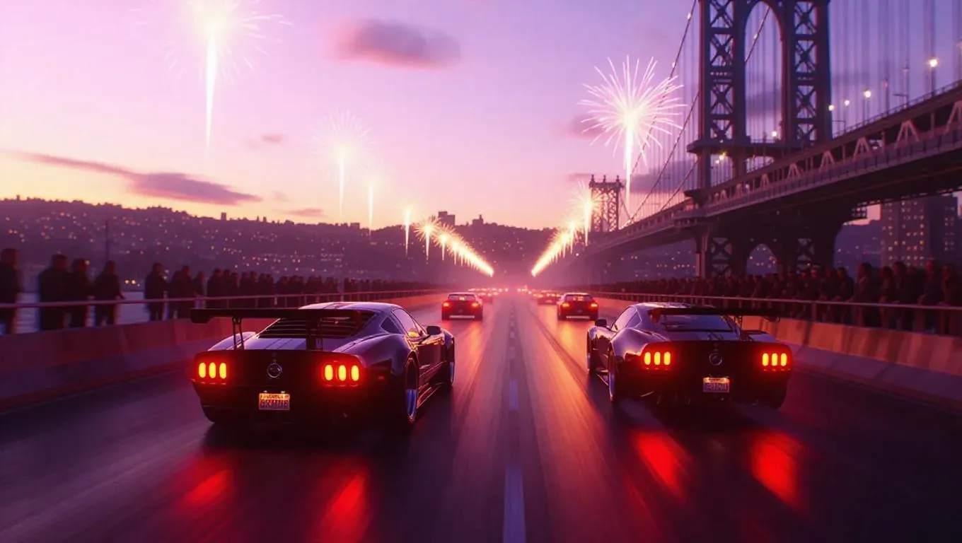 A spontaneous street race on a bridge over the river, engines roaring underneath shooting stars as fireworks burst near the finish line. Spectators crowd the edges, faces lit by car headlights. High-speed cinematic motion and soft pastel-toned gradients.