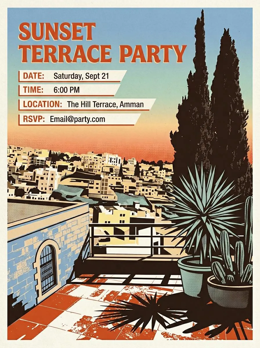 using these images, make a sunset party invite with the aesthetic of a nostalgic poster, make sure its good enough to be the background for text. Can u use the colors attached and can you make it less AI and more like a graphic