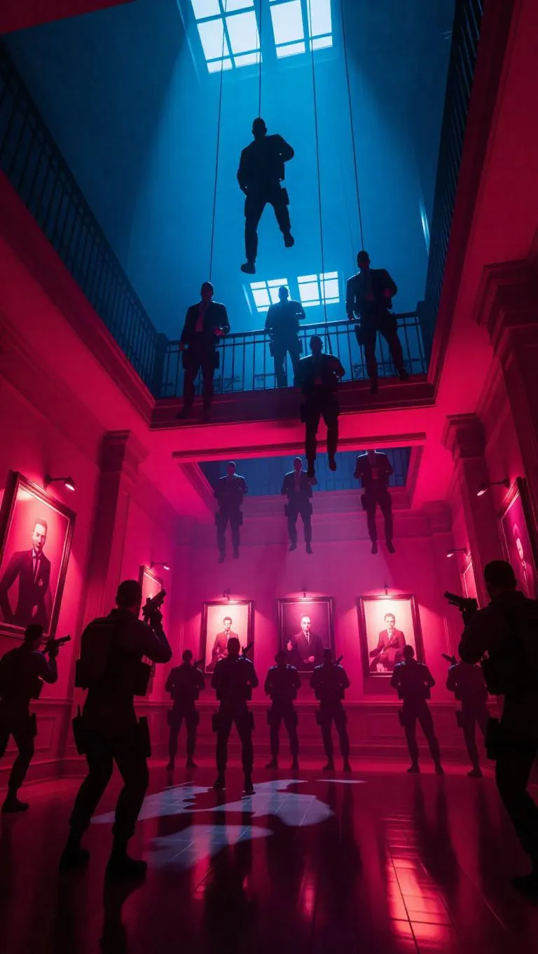 Inside a trendy art gallery in Liberty City, a high-stakes heist unfolds. Thieves, clad in sophisticated outfits, descend from the ceiling using ropes, stealthily stealing priceless artifacts. Alarms blare, casting a chaotic coral light, as security guards sprint through the halls, guns in hand, to intercept the criminals.