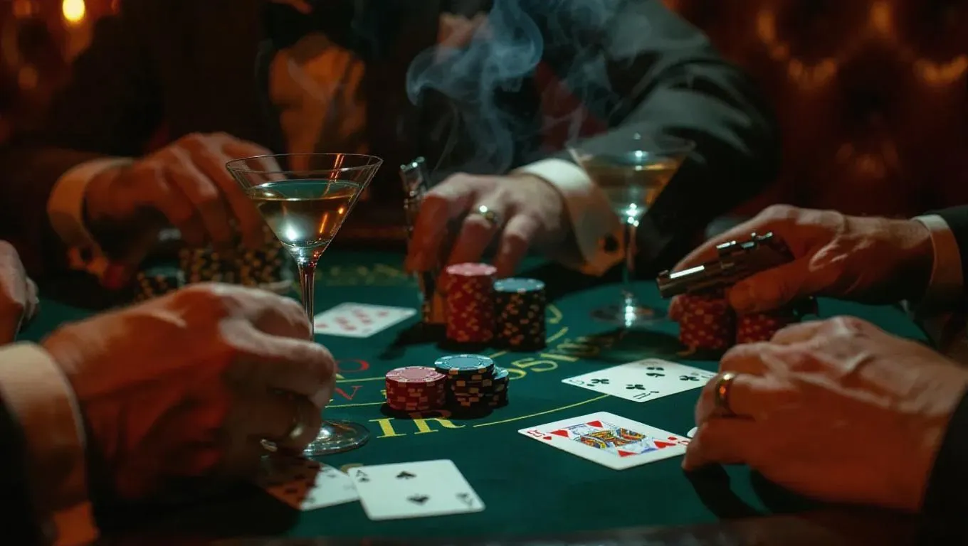 A secretive gambling night among criminals in an old nightclub, where firearms lie still beside martini glasses and rough hands clutch fateful cards. Smoke mixes with light. Gritty, jazz-noir visual texture with rich darkness.