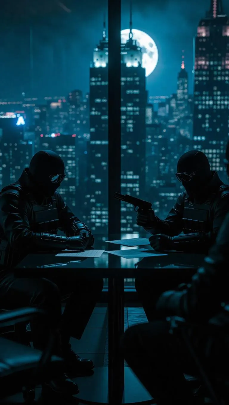 A clandestine meeting unfolds in a skyscraper penthouse bathed in cold moonlight, where leather-clad negotiators flanked by armed guards exchange documents. Below, the city breathes in subtle nuances, and a sniper scope glints in the dark. Long-lens compression with cinematic bokeh, stylized atmospheric haze.