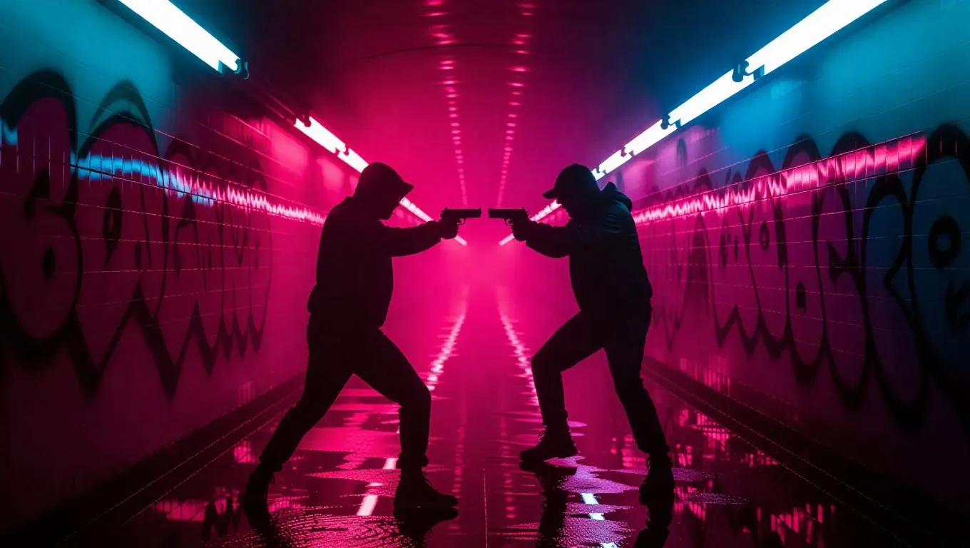 Two rival gangs confront each other in an underground subway station, weapons clashing and echoing off the tiled walls. Graffiti and flickering lights enhance the chaotic atmosphere. The scene is captured with a gritty, urban palette, emphasizing tension and danger.