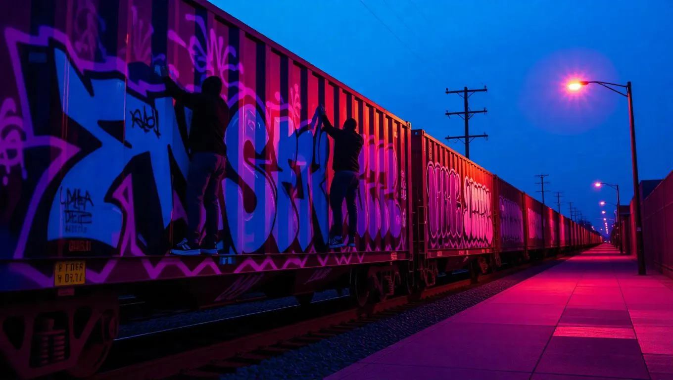 A crew of street artists spray-paints a large mural across the surface of a cargo train, their outlines glowing under the illuminated streetlight. The distant sound of police sirens rings out, hinting at their quick exit. The backdrop showcases a vibrant, urban scene with a cool color tone.