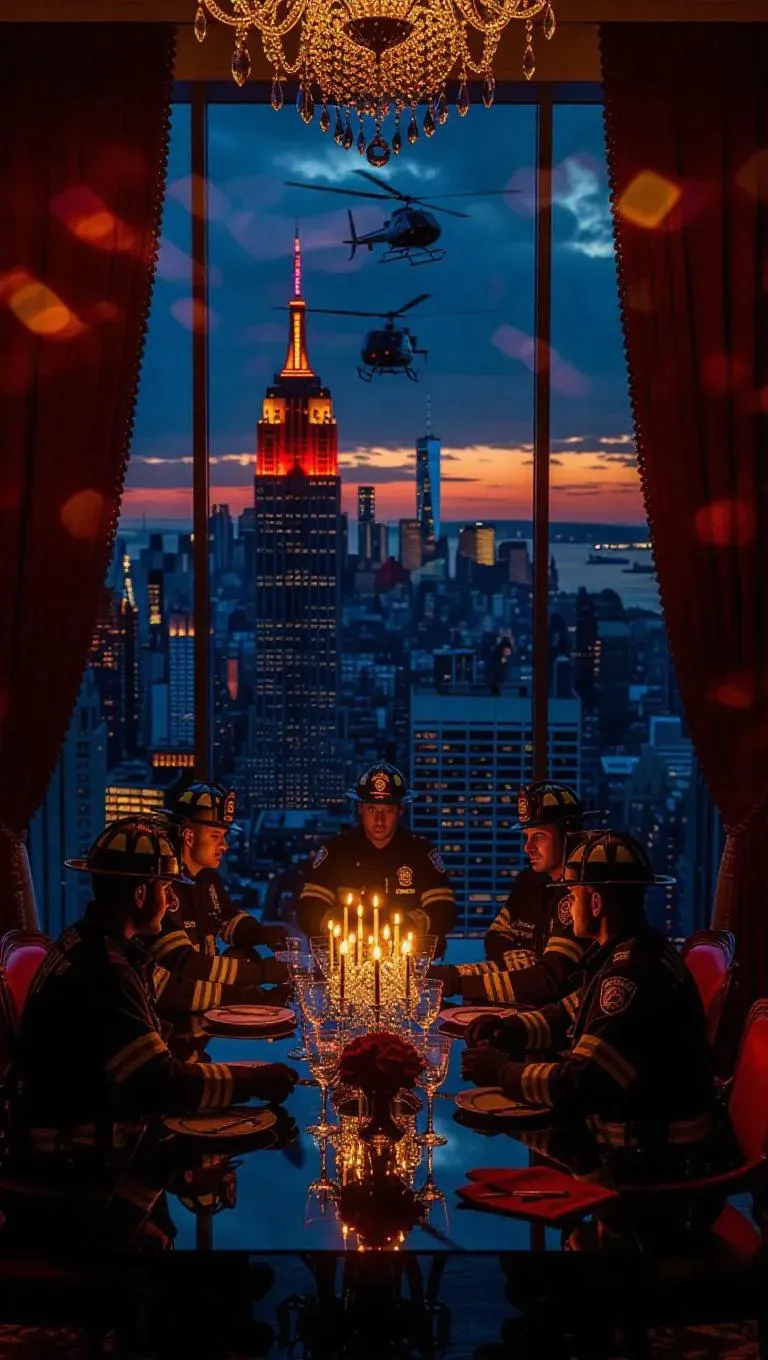 A luxury penthouse blazes with siren light as elite firefighters break through the glass walls, hoses raised, catching the reflection of a crime boss mid-celebration. Crystal chandeliers shatter midair, frozen in a ballet of chaos, while the skyline burns with nightlife neon. Velvet drapes twist in the wind from the broken balcony, revealing a helicopter hovering between skyscrapers. Dynamic interior-exterior contrast with cinematic lens flare and high-saturation lighting.