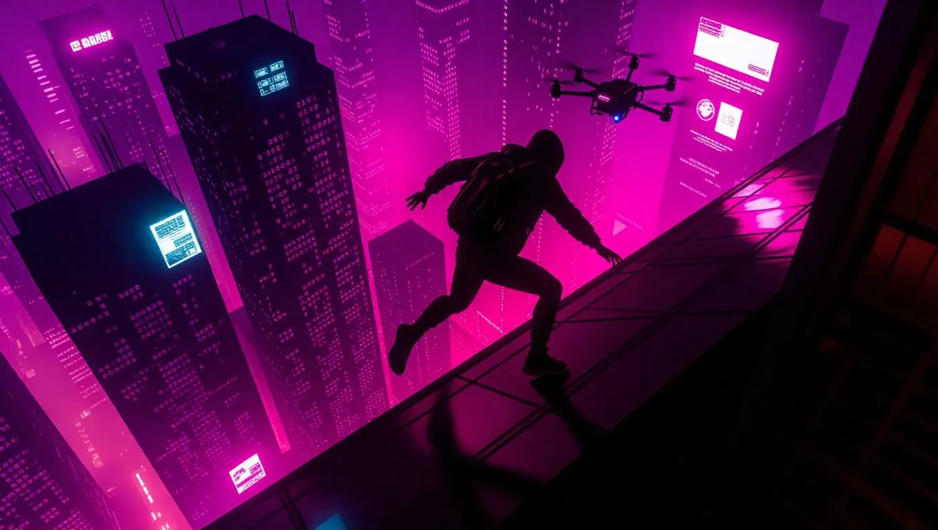 A daring thief sprints across neon-lit cyberpunk rooftops, pursued by relentless hackers and hovering drones. The skyline glows with screens and pulsating lights, creating a vibrant, chaotic atmosphere.