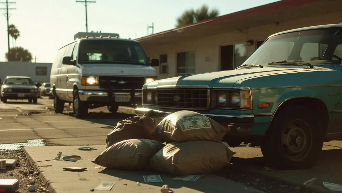 A tense exchange unfolds in a state of disrepair motel parking lot, duffel bags of cash and drugs spread on the hood of a beater car. Headlights abruptly flood the scene as an arriving van skids to a halt, capturing the chaos with erratic motion and a gritty, shadowed atmosphere.