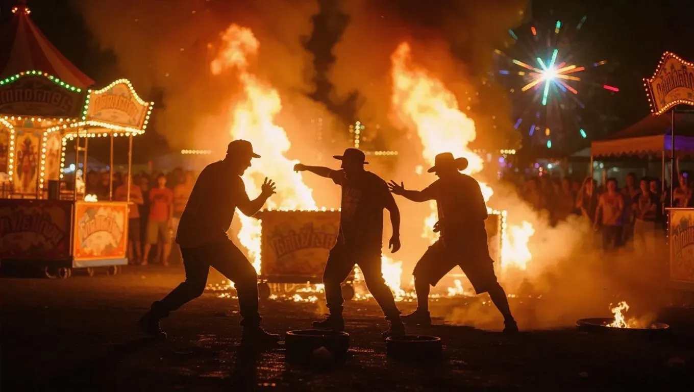 Two rival gangs clash at a carnival, using carnival games and rides as weapons, the scene illuminated by the warm, flickering glow of burning tires, creating a chaotic, gritty, and intense atmosphere.