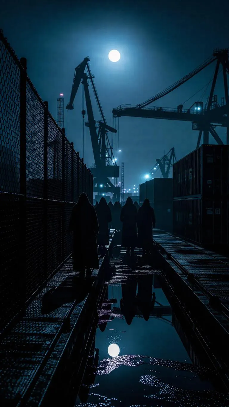A moonlit dockyard shudders with distant alarms as hooded phantoms unload crates into a barge bobbing beside weedy pilings. Shipping containers loom like ghosts, each marked with gang emblems and dark traces. Overhead, a crane’s halogen floodlight illuminates the figures in vivid contrast against the harbor mist. Beyond the chain-link fence, flashing lights break through the haze, their reflections flickering in scattered puddles. Tight medium shot capturing glistening tension and heavy shadows, with grungy textures and chilling framing.