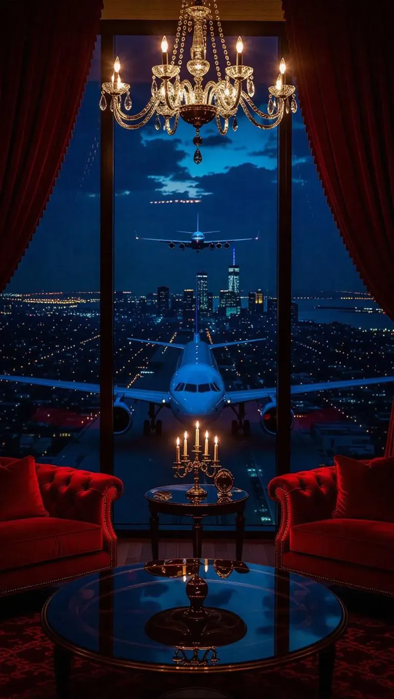 A luxury penthouse blazes with siren light as elite patrol units breach the glass walls, body armor shining, catching the reflection of a crime boss mid-glance. Crystal chandeliers shatter midair, frozen in a ballet of chaos, while the skyline burns with nightlife neon. Velvet drapes twist in the wind from the broken balcony, revealing a firefighting plane hovering between skyscrapers. Dynamic interior-exterior contrast with cinematic lens flare and high-saturation lighting.