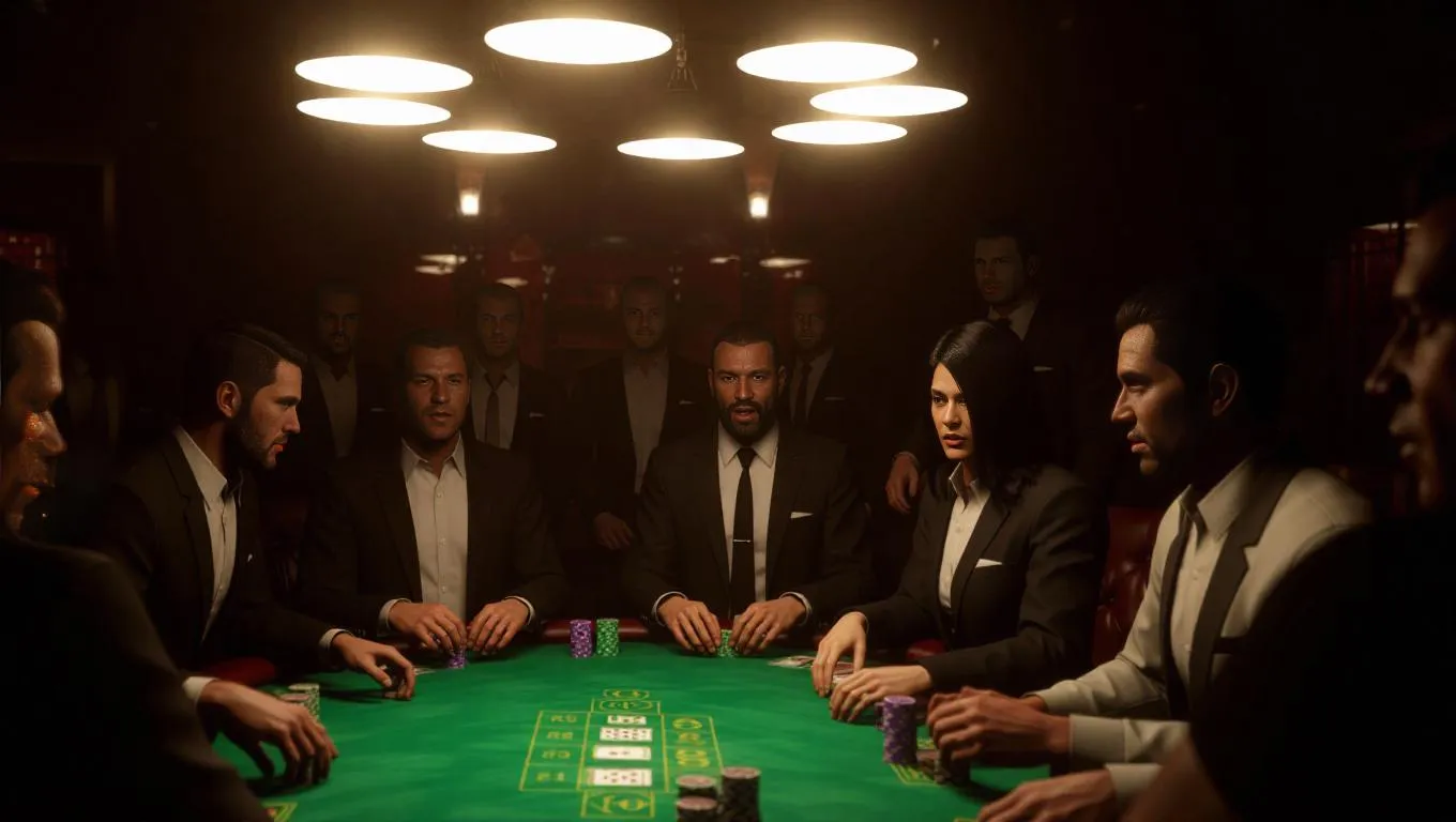 In a dimly-lit underground casino in Liberty City, a tense high-stakes poker game is abruptly interrupted by a swarm of journalists. Tables overturn, cameras scatter, and players shout protests, the room erupting into chaos as they prepare to defend their secrets.